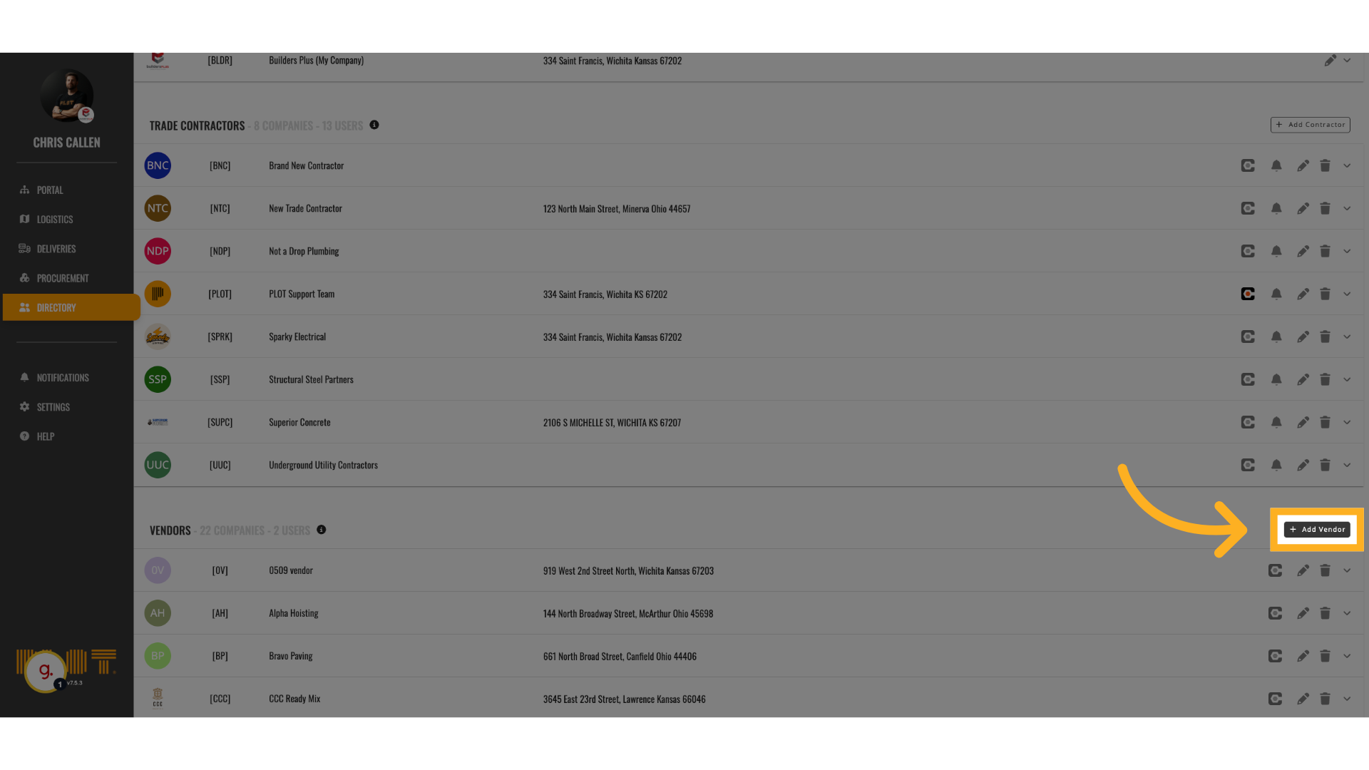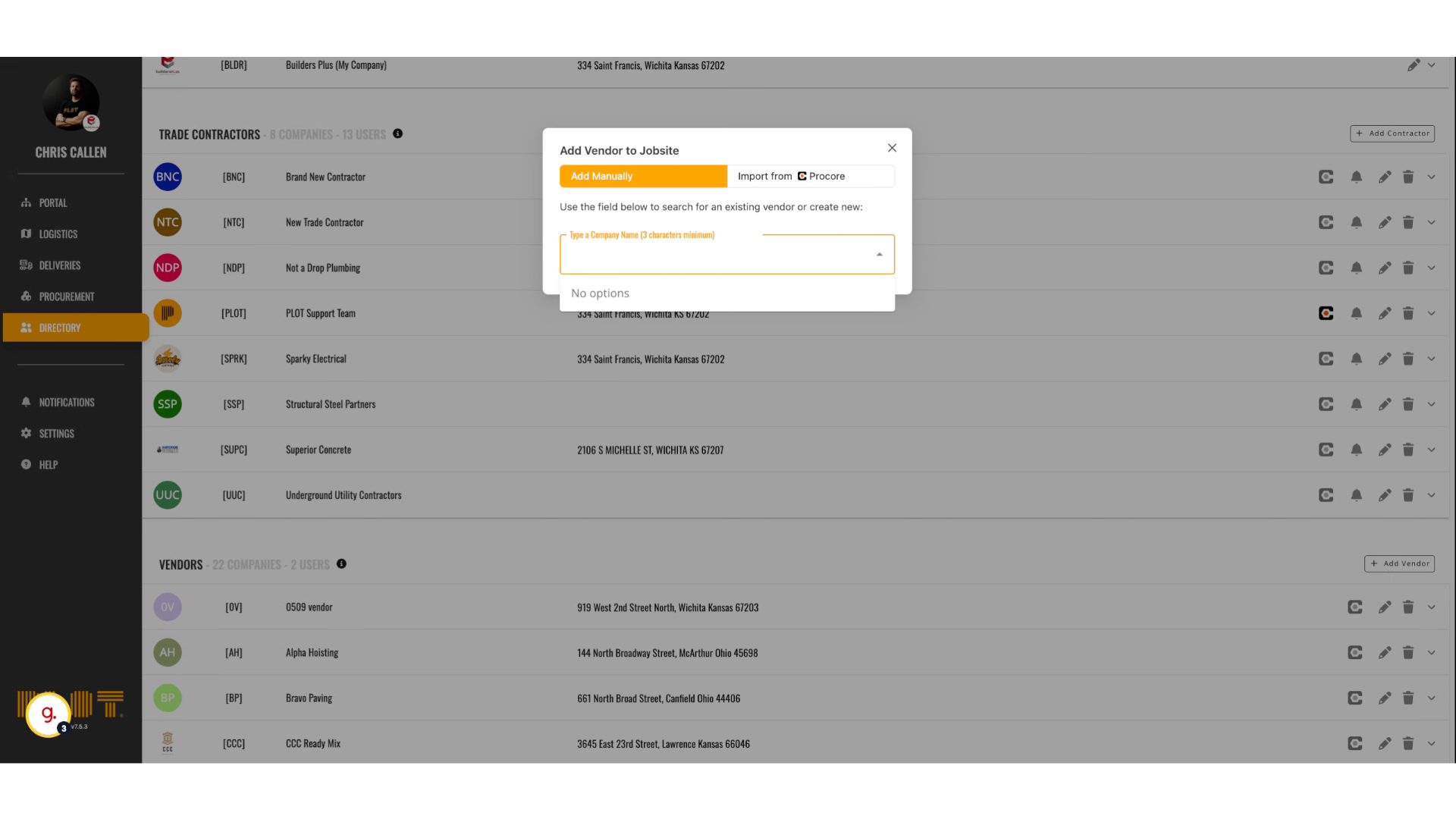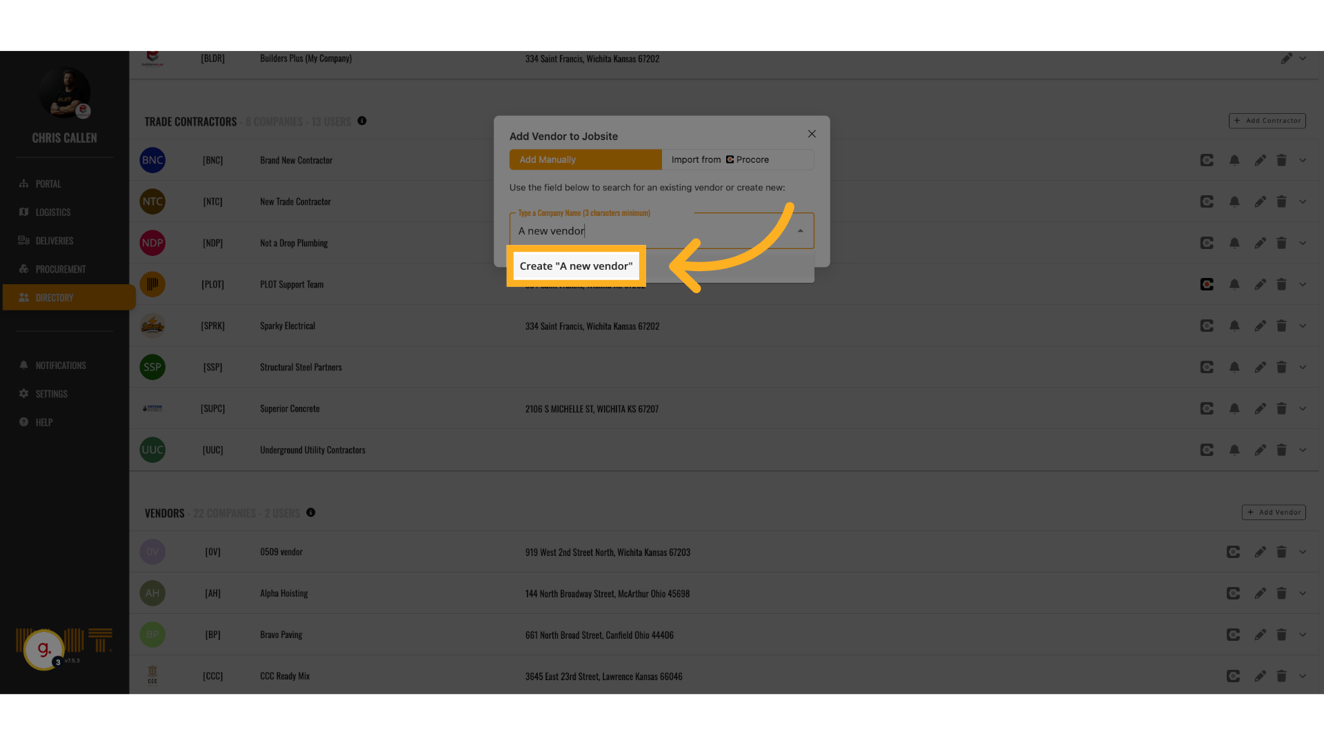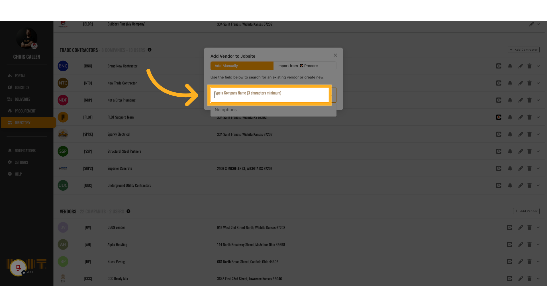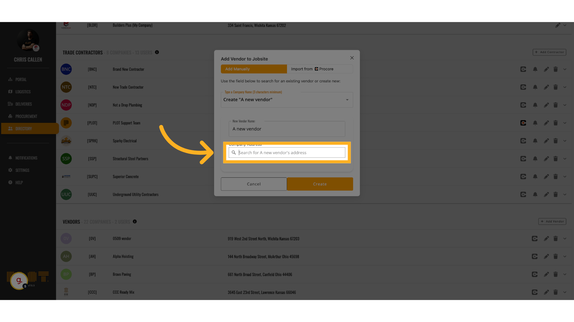 Search for the vendor's address to associate accurate location information with their profile. All Deliveries assigned to this vendor will use this address and provide a 'distance to jobsite' value.