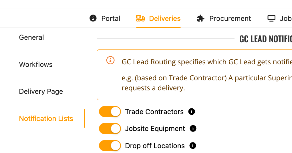Use this setting to allow specific GC Leads to get notifications based on which location or equipment the delivery is associated with, or based on which Trade Partner requested it.