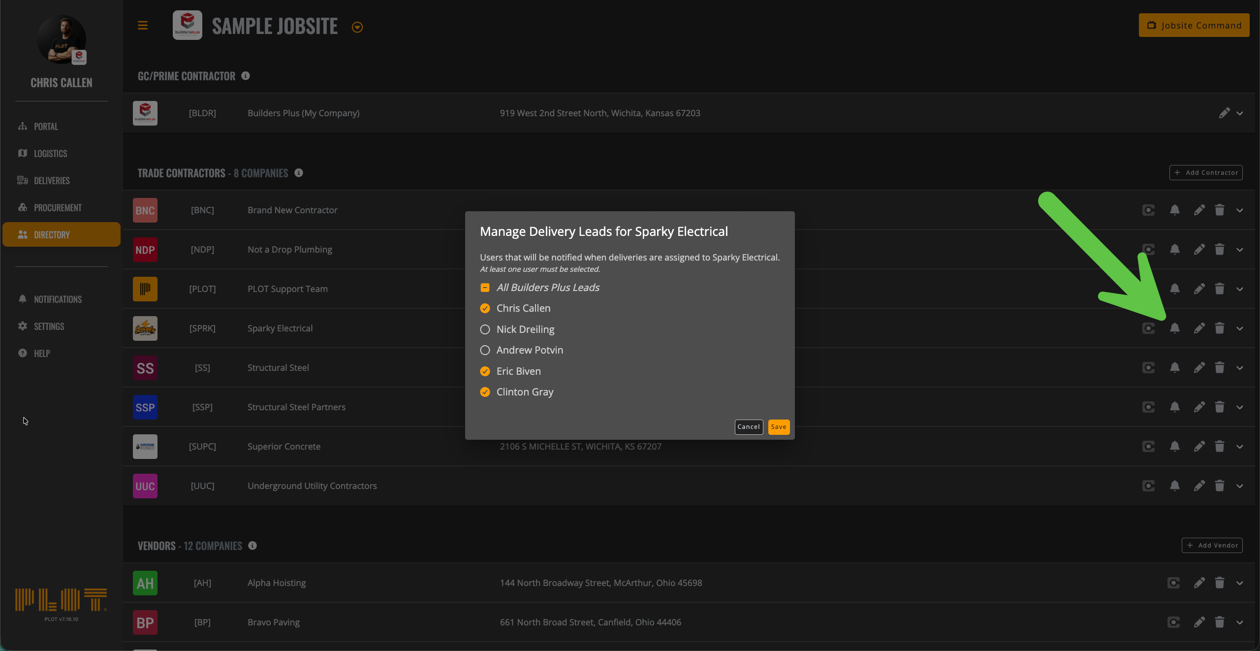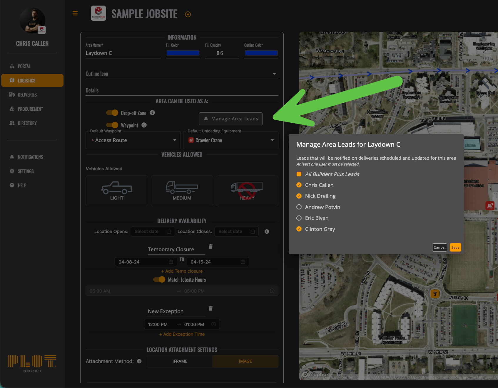 The tricky thing about this setting is if more than one toggle above is selected, PLOT will look at the largest unique set of Leads to notify. For example, if the Delivery is dropping off at Laydown A, using the Tower Crane, and received by the Sparky Electrical Service (where Laydown A leads are limited to Sarah, but the Trade Sparky is still notifying all GC Leads), PLOT will notify all GC Leads.