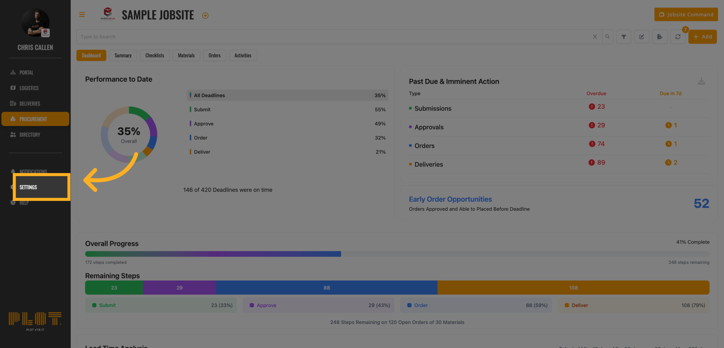 Access the Settings menu to begin configuring your procurement preferences. This is limited to user GC Lead permissions