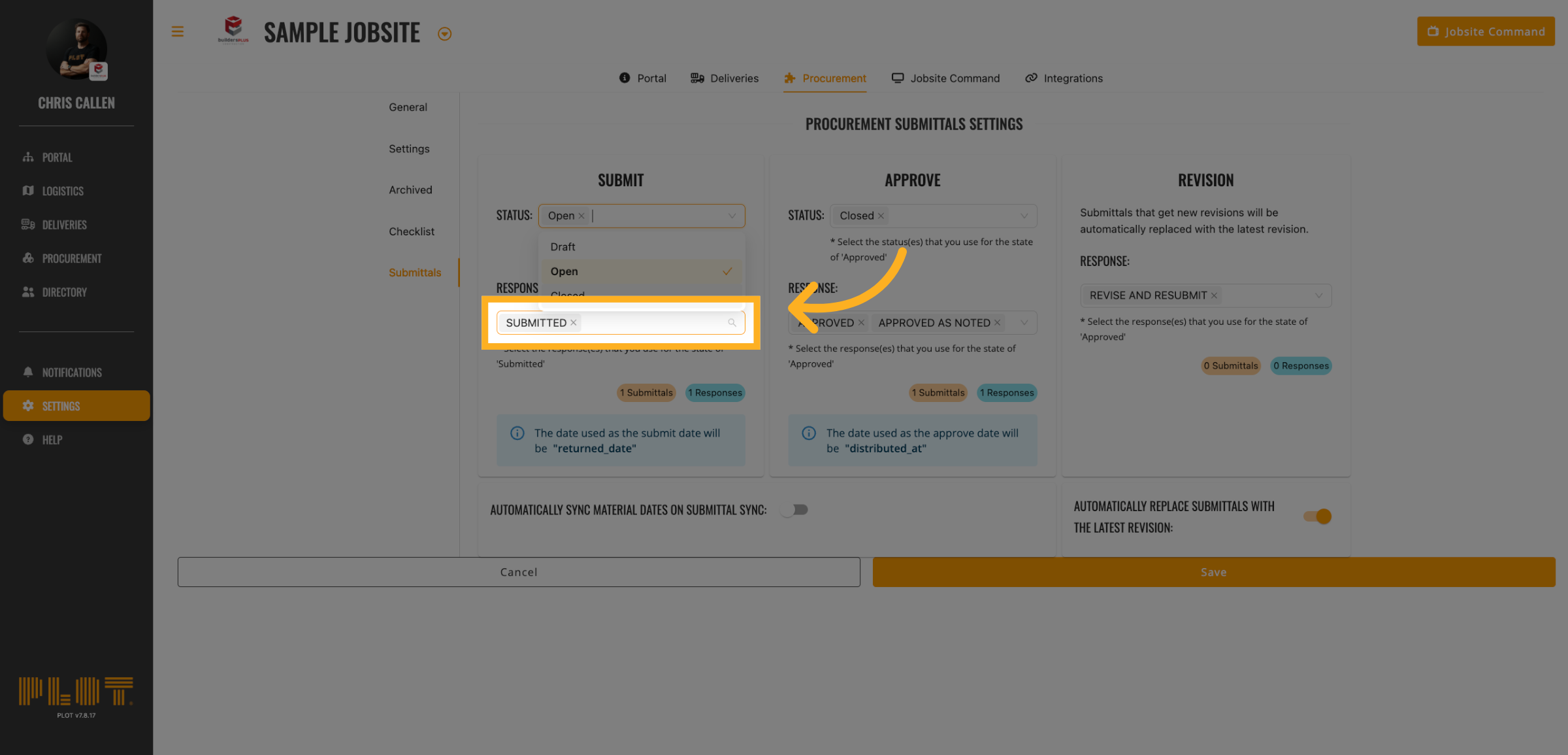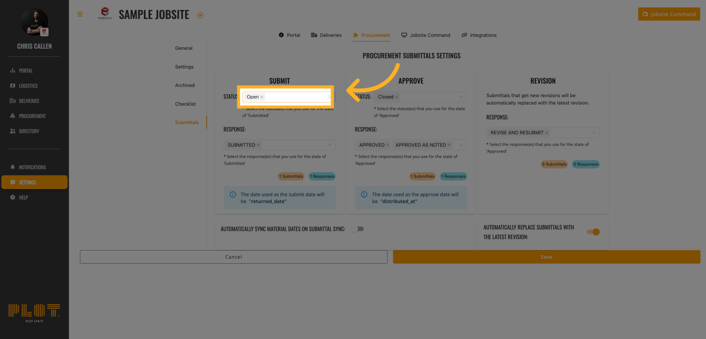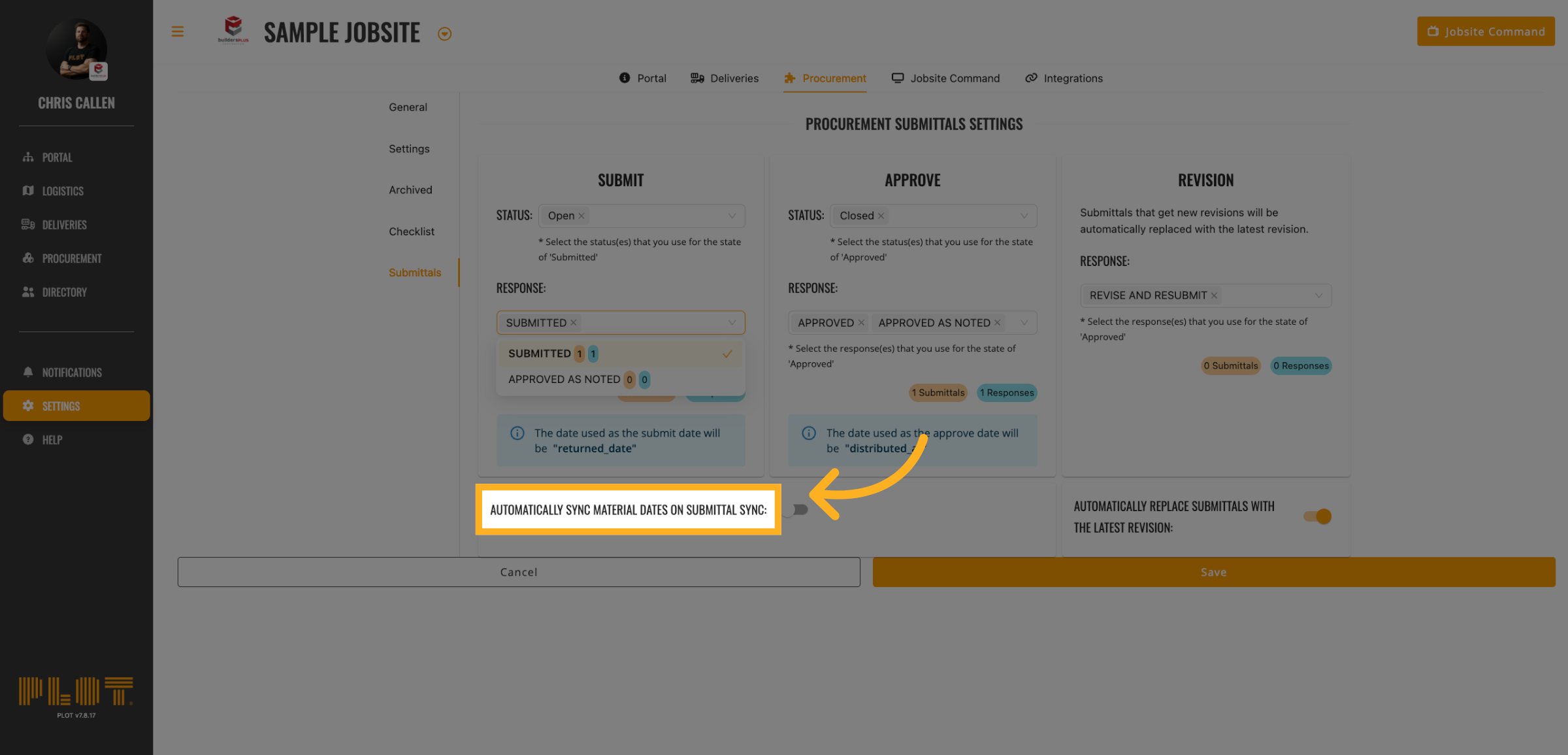 Click "Automatically Sync Material Dates on Submittal Sync:"