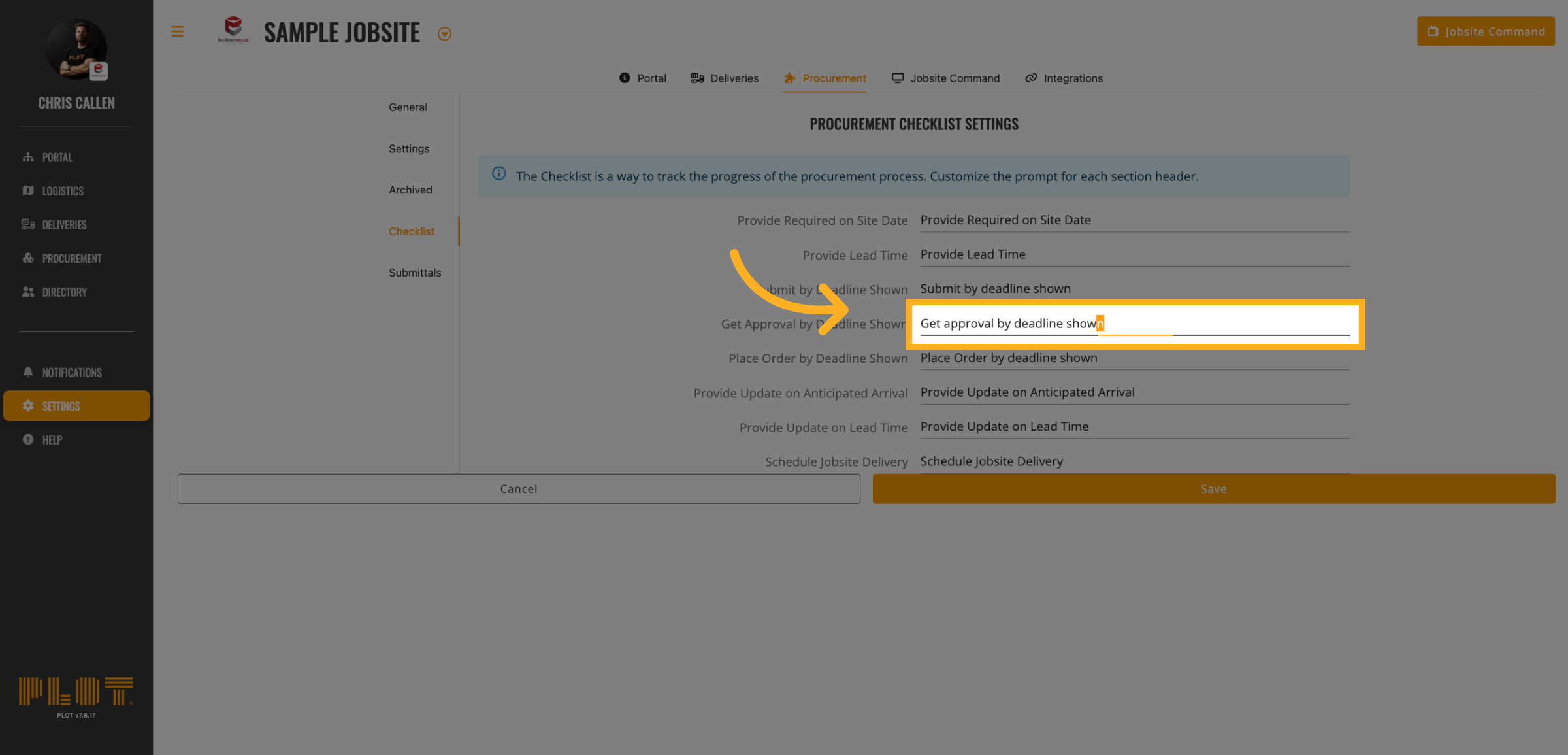This page allows you to manage what text displays in the Checklist pages within PLOT (including Jobsite Command's checklist module) and Weekly Procurement Checklist email.