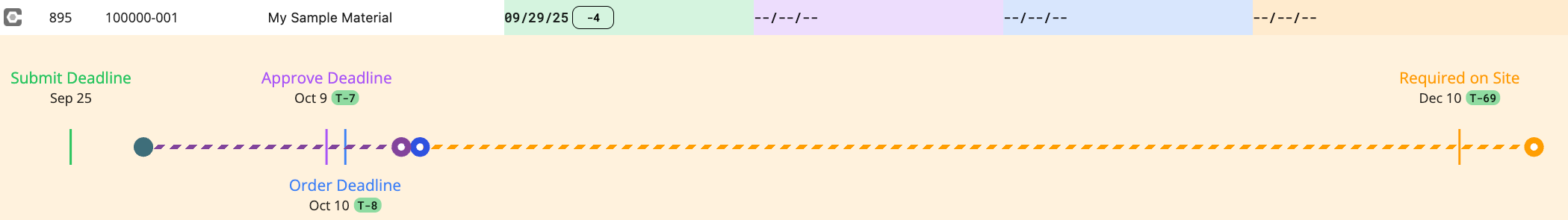 PLOT use simple calculations to calculate deadlines. This calculation works backwards from the 'Required on Site' date. They are represented by the vertical bars in the Push/Pull Scheduling Graphic.